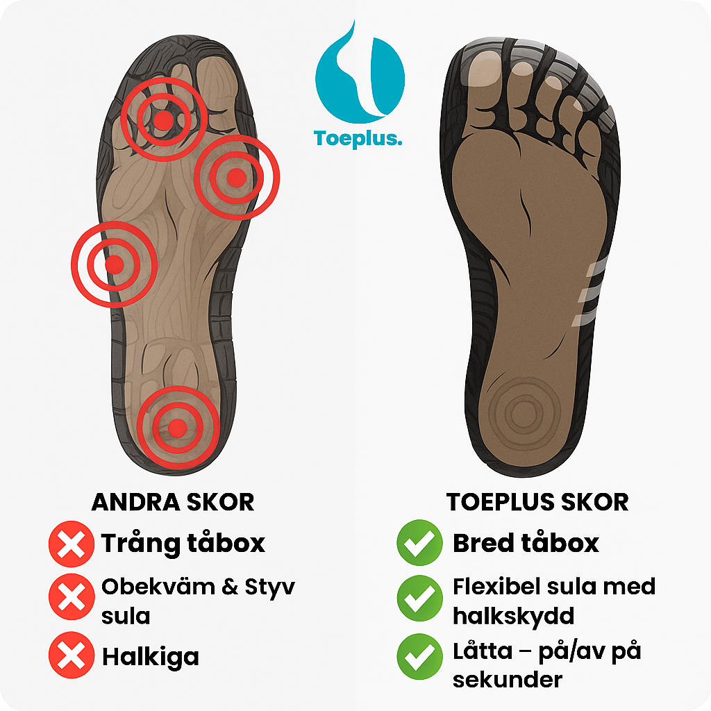 Trötta, ömma fötter? Knän och rygg som protesterar efter en lång dag? Toeplus är skapad för dig som är klar med tunga, trånga skor som låser foten och gör varje steg jobbigare än det behöver vara.
